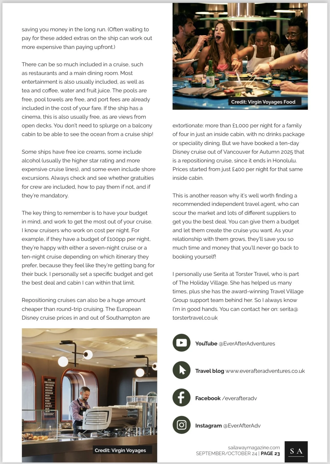 I am really proud of the articles I have written for “Sail Away Magazine”, without a doubt the best cruising magazine around, their focus’ on honest reviews, genuine recommendations and tips & tricks for all things cruise; from booking, to traveling to enjoying!